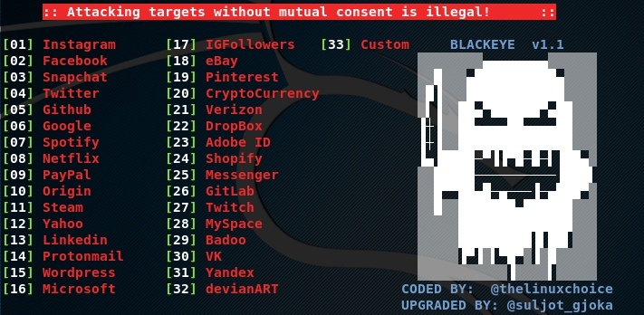 BLACKEYE-это инструмент фишинга в локальной сети, который может клонировать более 30 шаблонов социальных сетей для создания фишинговых страниц. Некоторые из таких сетей как Google, Yahoo и Microsoft, в системе PayPal, важными, на eBay, криптовалюта, Твиттер, Facebook, GitHub, и LinkedIn. Кроме того, генерируя шаблоны этих сетей, BLACKEYE также предлагает опцию пользовательского шаблона для создания пользовательской фишинг-страницы.