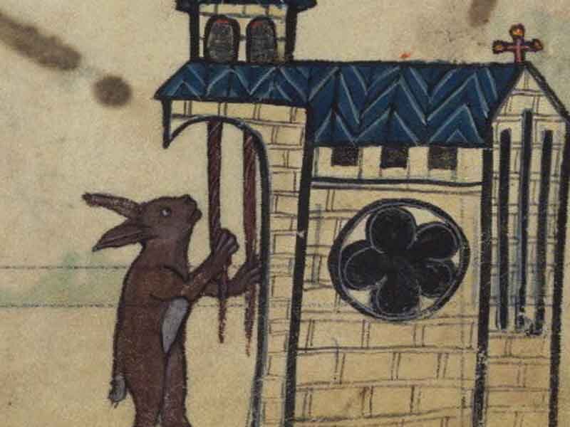 Так вот, та часть с Часами Христа Распятого и представляют собой самую большую загадку этого манускрипта. Не текст, а иллюстрации к ней. На полях изображены животные и сцены из популярного в Средние века Романа о Лисе . В частности — похороны Лиса Ренара. Это любимый сюжет средневековой сатиры, имеющей явно антиклерикальный смысл. Звери, отслужив по Ренару заупокойную мессу, с крестами, кадилами и свечами выстроились в процессию и понесли гроб на кладбище.