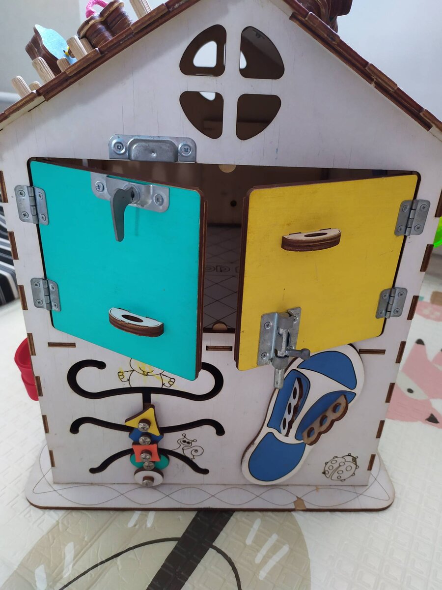 Сделан он из фанеры, никаких сучков и неровных краев нет. Все стороны дома и крыша с разными тренажерами и играми для ребенка.