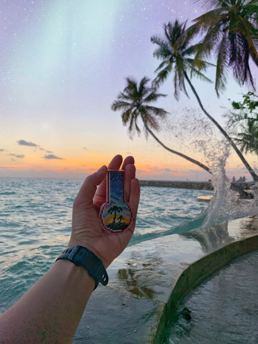 Так получилось, что вышивала я, рисовала схему Таня, а на Мальдивы полетела Марина 😅 Рассказываю: вместе с Татьяной Чайниковой мы нарисовали буклет 6 замочных скважин, буквально недавно я их вам презентовала. Схемы мы рисовали вместе, три штуки я, и три штуки Таня. А затем я задумала сфотографировать вышитые замочные скважины в тех же местах, которые на них нарисованы. Задача довольно сложная, но не настолько уж невыполнимая! Поэтому у меня уже есть три фотографии по моей задумке: первая фотография сделана Мариной на Мальдивах на фоне пальм. Ночное небо слегка дорисовано, т.к. сюжет не настолько реалистичный и получить такой в реальности сложно :) Приедет ко мне моя малышка с запахом моря и песка! Понятное дело найти и корабль и рыбок сложно, но что-то морское - вполне. Идеальная фотография на мой взгляд! Да-да, она ещё и искупалась! Хорошо, что пластиковая канва быстро сохнет :) Фото замочной скважины "Времена года" в принципе невозможно к исполнению, но я нашла в Ботаническом с