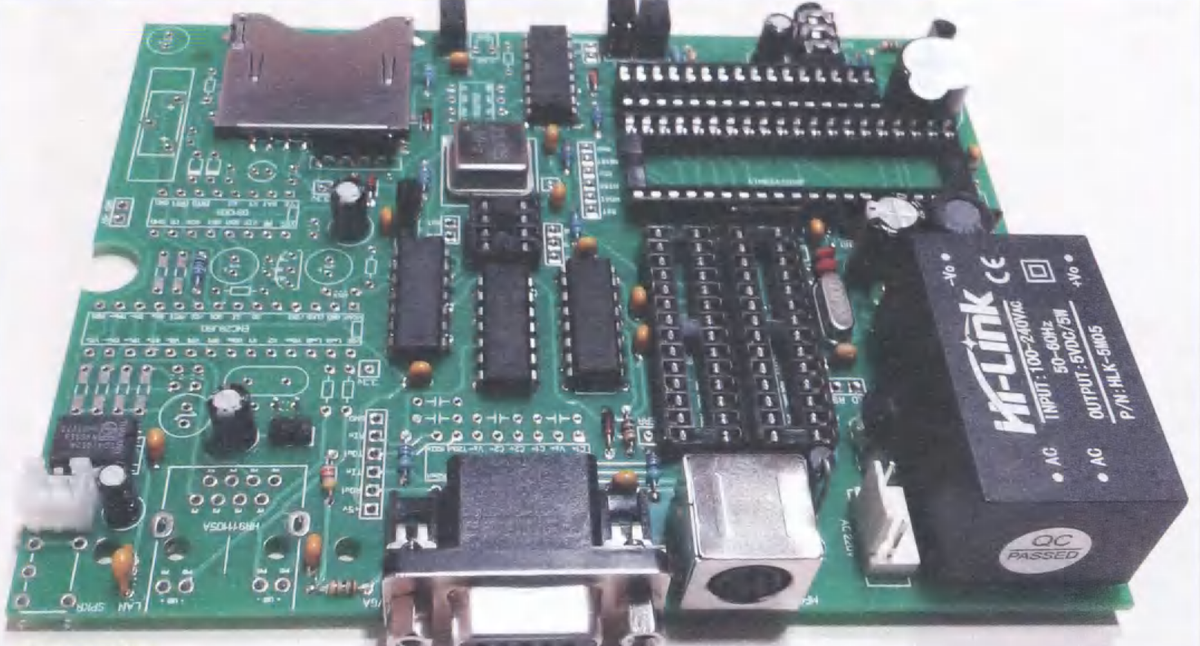 Рекомендую сборку производить, начиная с минимальной работоспособной конфигурации. Внешний вид собранной платы в такой минимальной конфигурации, на которой отсутствуют "опционные" элементы, показан на рисунке в заголовке статьи. В этом случае не устанавливают микросхему ЧРВ DS 1305 N ( DD 4), контроллер Ethernet ENC 28 J 60 ( DD 6), преобразователь уровней МАХ232СРЕ ( DD 7), микросхему ПЗУ 25 LC 1024- l / P ( DS 2), стабилизатор LD 1 117-33 ( DA 2), разъём " LAN " HR 911105 A (А2), кварцевые резонаторы 32768 Гц ( ZQ 1) и 25 МГц ( ZQ 3), резисторы R 14, R 23— R 28, конденсаторы С17, С18, С24—С27, СЗЗ— С37, дроссель L 2 и элемент питания G 1 .