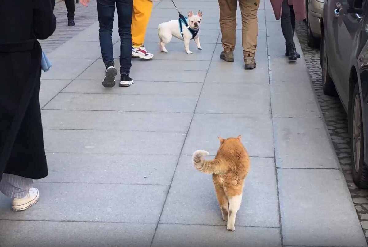 Стычка рыжего обитателя знаменитой пышечной в центре Петербурга с собакой попала на видео.