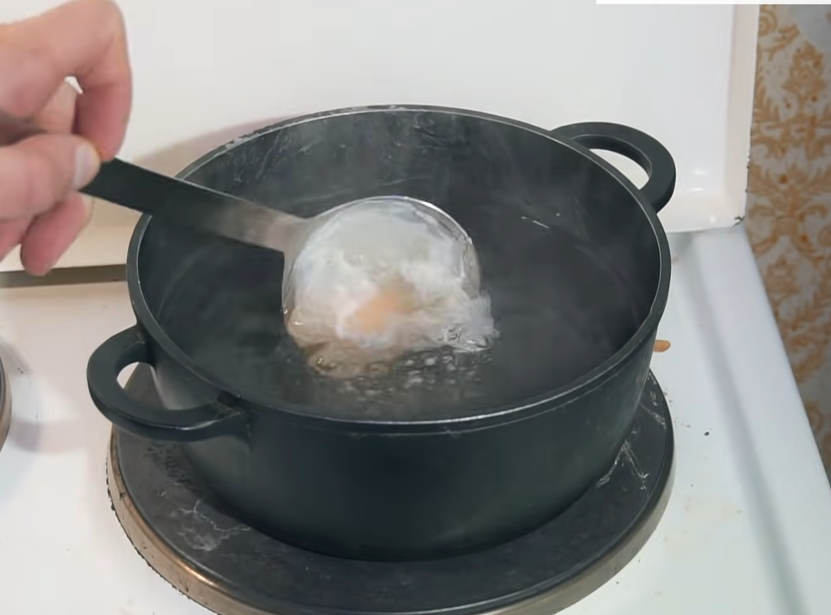 Белок начнёт сворачиваться, не даём белку разбежаться по кастрюле. Спустя 2-3 минуты можно вытаскивать.