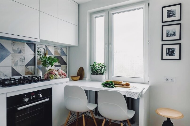 Подоконник как продолжение рабочей поверхности на кухне создает дополнительный функционал. Обязательно предусмотрите вентиляцию для радиатора в виде перфорации в столешнице. Если хотите разместить мойку перед окном, помните, что окно может не до конца открываться из-за крана.