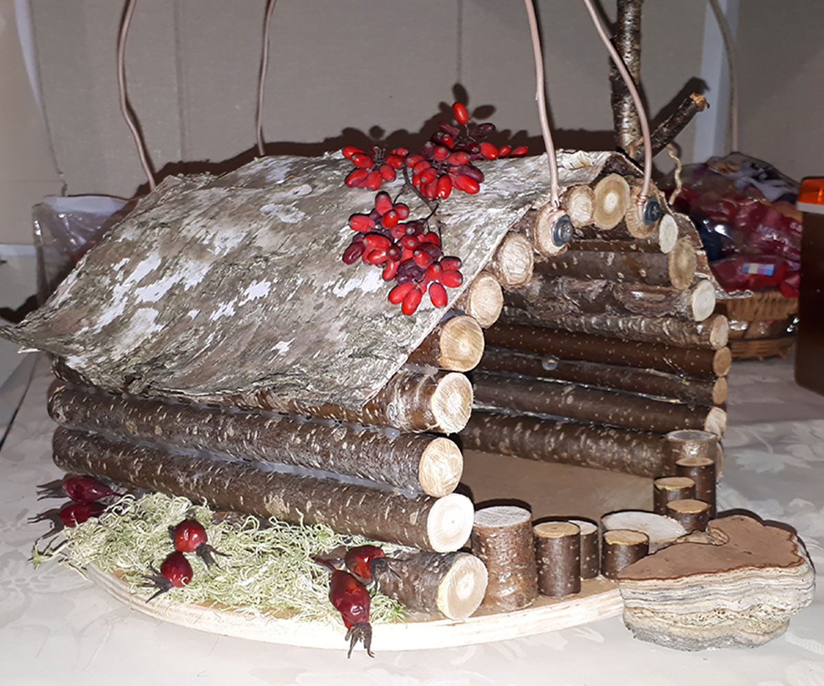 Решили изготовить из дерева и коры. Слава богу, мы живем в пригороде и собрать деревяшки не составило труда. Мы с дочкой и внучкой пошли в лес, благо рядом. Набрали нужные нам материалы. Естественно кору и ветки нужно было просушить, использовали духовку. Ладно это полбеды, далее надо было напилить палки определенного размера и просверлить дырочки. Подключился уже зять. Потом встал вопрос об основе кормушки, тут на помощь пришел муж, выпилил круг из фанеры. У меня был свежий сфагнум, проводила эксперимент по выращиванию мха в домашних условиях, пригодился. Даже древесный гриб пошел в дело!