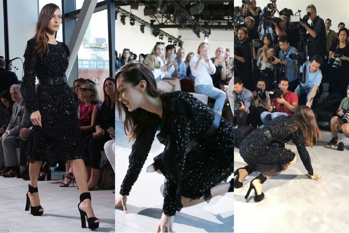 1. Во время дефиле на показе Майкла Корса на Нью-Йоркской неделе моды, знаменитая модель Белла Хадид не смогла устоять на 15-сантиметровых каблуках. К счастью, модель успела приземлиться на руки, иначе последовали бы серьёзные травмы. Произошло это уже под конец показа и Белла оказалась в самом фокусе камер. И тем не менее девушка поднялась и с улыбкой завершила свой проход!