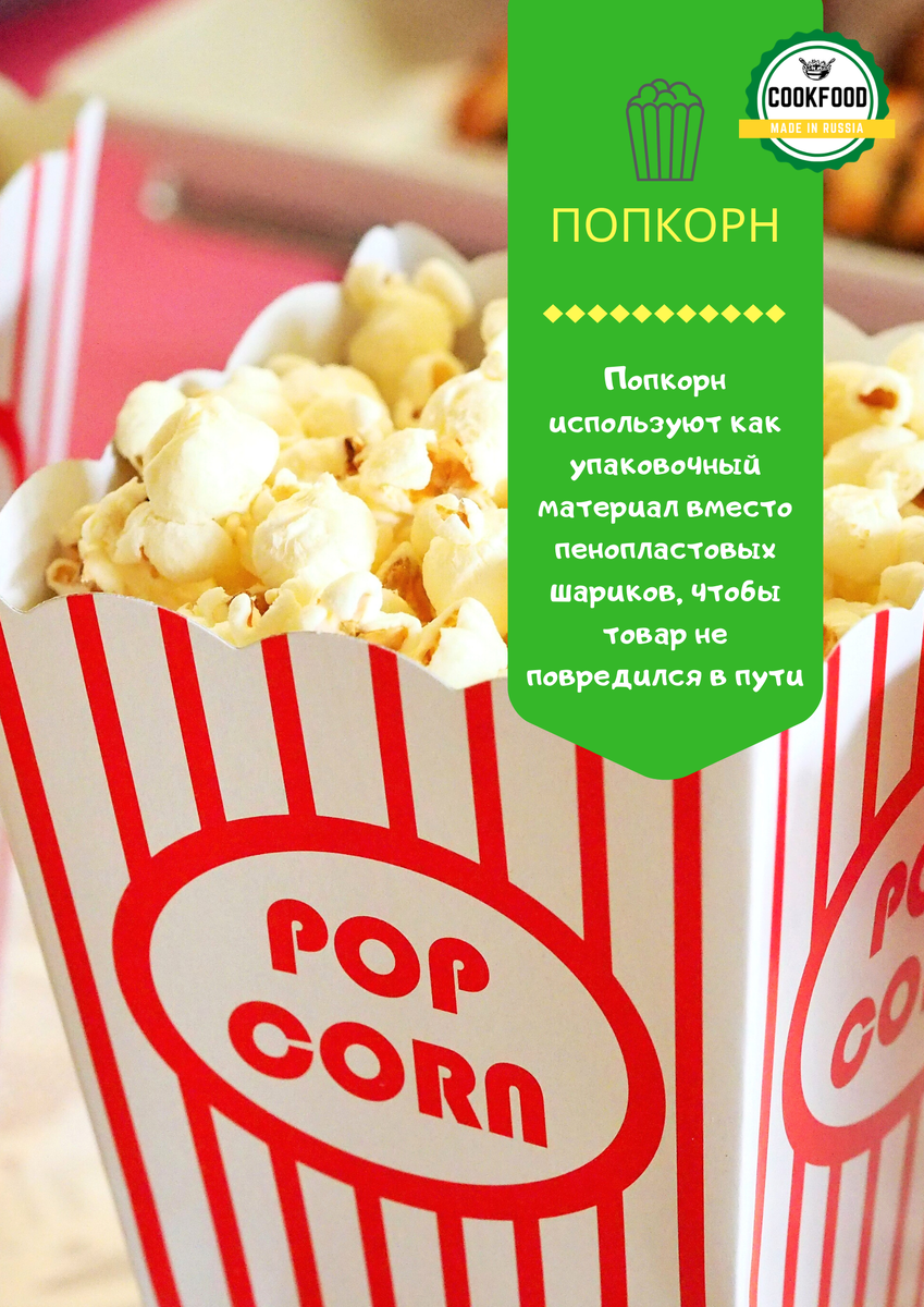 Попкорн используют некоторыми торговыми компаниями как упаковочный материал вместо пенопластовых шариков, чтобы хрупкий товар не повредился в пути. После того, как товар доставляется на место, он идет на корм птицам или скоту.