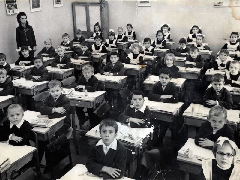 В младших классах сидеть за наклонной зеленой партой с откидной крышкой и отверстием для чернильницы. Чернил давно не было, а парты еще сохранились.
