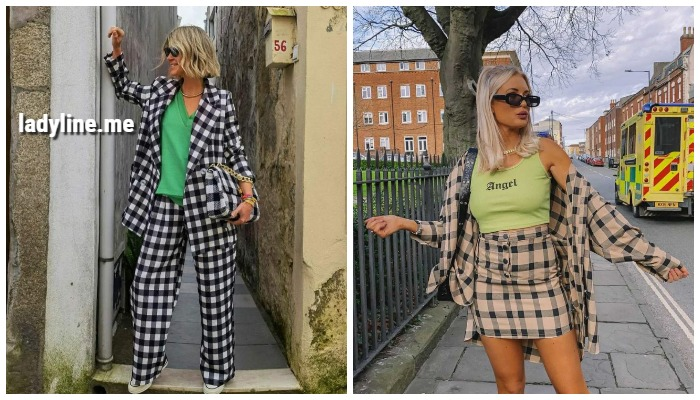 Начнем с эффектных брючных костюмов в трендовый принт «клетка» — этот наряд уже смело можно назвать базовой деталью женского гардероба. Стилисты чаще всего предпочитают комбинировать клетчатые брючные костюмы с яркими лонгсливами, однотонными водолазками, а также белоснежными рубашками легкого оверсайз размера.