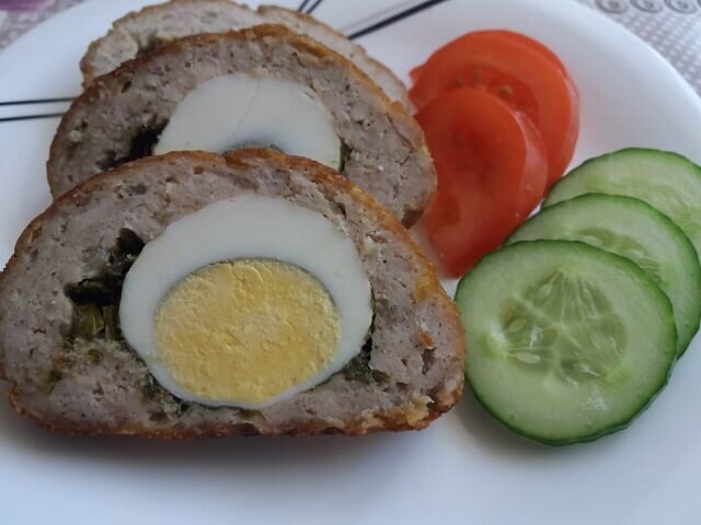 Блюд из мясного фарша существует множество. Все они хороши тем, что готовятся быстро как в духовке, так и на сковороде. Это не только банальные котлеты, тефтели или зразы. Предлагаю вам приготовить еще одно блюдо – мясной рулет с начинкой из вареных яиц. Получается очень вкусно. Блюдо может быть в повседневном меню, но и отлично будет смотреться на праздничном столе. Основой будет мясной фарш. Его можно приготовить либо из одного вида мяса, или же прокрутить через мясорубку несколько видов мяса. В моем рецепте используется свиная грудинка и куриное мясо. На мой взгляд, такое сочетание как нельзя подойдет для приготовления этого блюда. Незначительное количество жира в свинине придаст сочность, а курица – мягкость. Чтобы фарш получился более вкусным, добавьте в него побольше лука. По желанию, если фарш будет слишком плотным, в него можно добавить булку, размоченную в 100 мл молока. Это сделает основу более мягкой и пышной. Ну и напоследок добавьте по своему вкусу соль и перец и все тщате