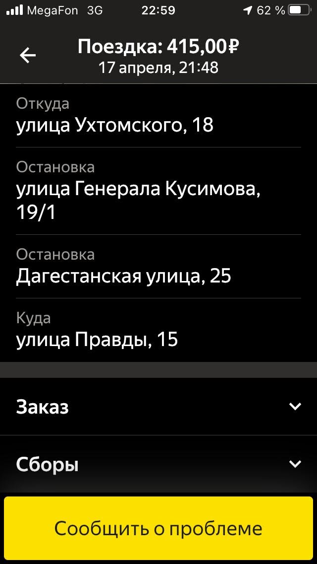Я в шоке. Не знаю что делать. Высадить ее не могу, полная машина, частный сектор. Предположил, что будет большой конфликт. Оценив всю ситуацию, принял решение, продолжить выполнение заказа. В итоге едем на конечный адрес. В салоне воняет просрочкой и теперь еще и собакой. Думаю, по окончании поездки выставлю счет за мойку. Но не тут то было. Начинается все самое интересное. Когда мы приехали на адрес, стоимость поездки таксометр рассчитал на 415 рублей. (и это за час работы!!!!). Пассажирка начала возмущать почему так дорого, ведь ей изначально оператор озвучил стоимость в 182 рубля. 182 рубля было без учета ожидания, а ожидание было долгим у каждого магазина и составило 233 рубля. Итого 415 рублей.