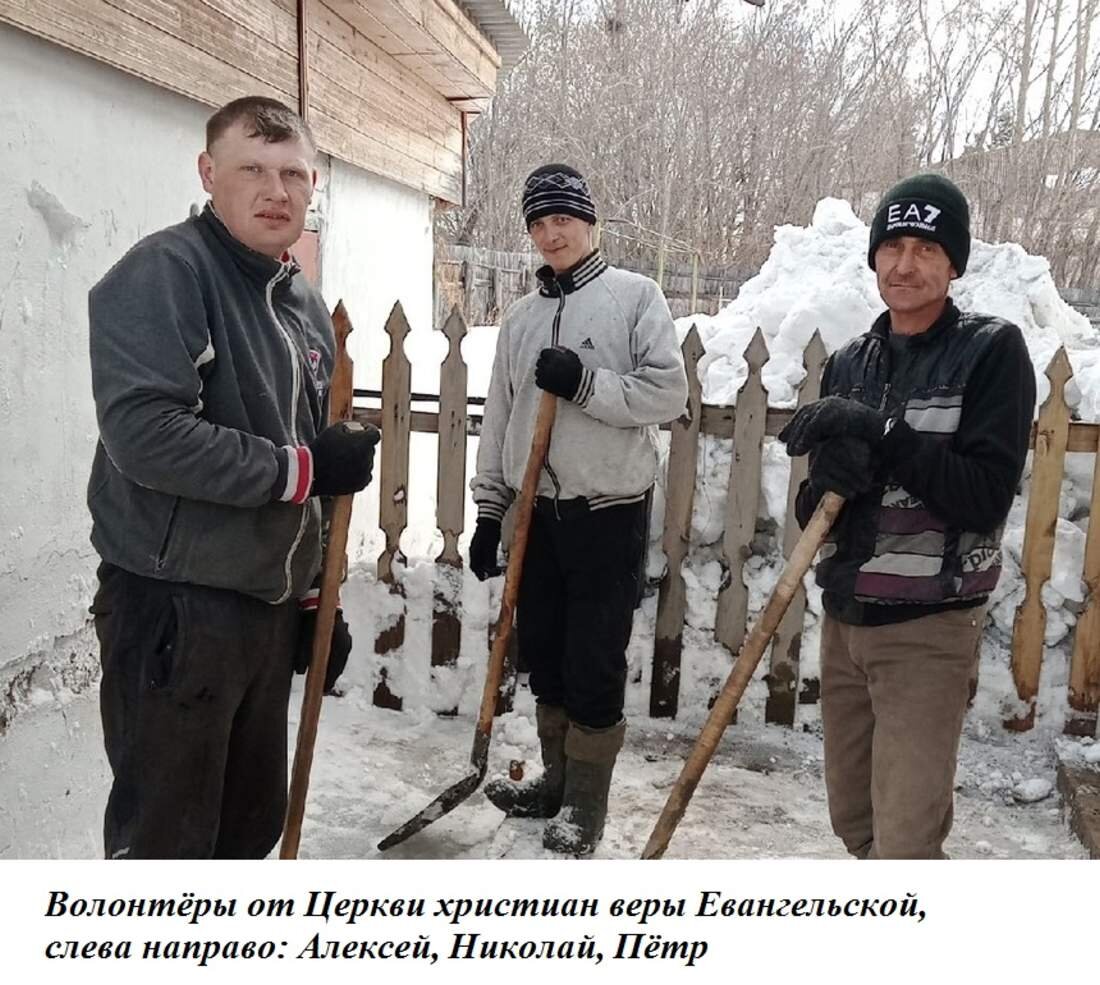 Да, пришли взрослые люди (Мария, Алексей, Николай и Пётр), да, бесплатные и добровольные помощники, но... от Церкви христиан веры Евангельской. Они без промедления, деловито приступили к работе, и уже во время оной выяснилось, что прислала их не СУЭК.