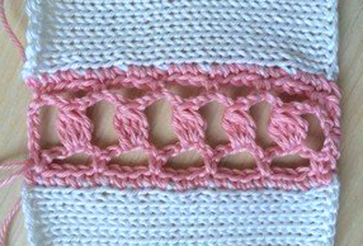 3. Две в.п., столбик без накида в середину перемычки, две в.п., столбик без накида в столбик обвязки следующей детали (столбик этот должен быть симметричен нижнему, чтобы обвязка была ровная)
