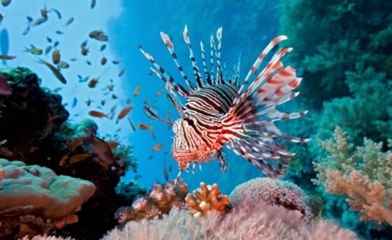Открывает наш рейтинг самых необычных обитателей глубин опасная и в то же время удивительная рыба-лев, также известная как полосатая крылатка или рыба-зебра. Это симпатичное создание длинной около 30 сантиметров большую часть времени находится среди кораллов в неподвижном состоянии, и лишь время от времени переплывает с одного места на другое. Благодаря красивой и необычной окраске, а также длинным веероподобным грудным и спинным плавникам эта рыба привлекает к себе внимание, как людей, так и морских обитателей.