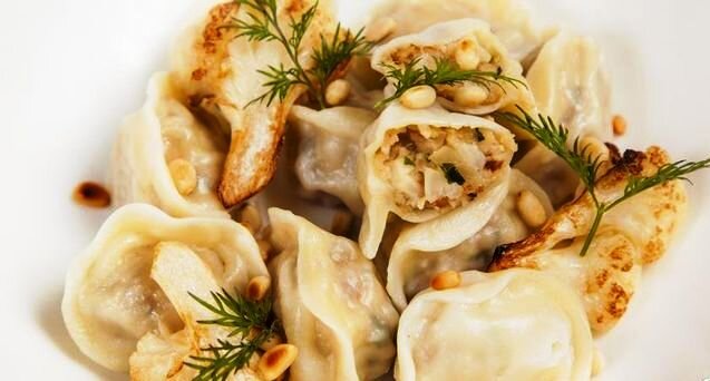 В кастрюле вскипятим воду и после закипания отварим вареники примерно 4-5 минут. Готовые вареники с цветной капустой подадим в тарелке на стол с зеленью петрушки и прижаренными кедровыми орешками.