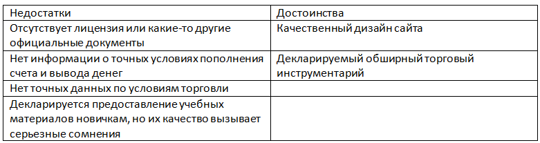 Сайт компании оформлен достаточно качественно, присутствует утверждение о наличии 4 настоящих офисов. Но кроме адресов никаких доказательств их реального существования нет. Другие положительные и отрицательные стороны компании вы можете увидеть в таблице:
