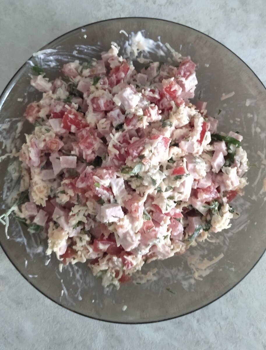 Колбасу нарезать на небольшие кубики,сыр натрите на мелкой тёрке, мелко порезать помидоры. Всё соединяем, добавляем зелень и майонез,хорошо
