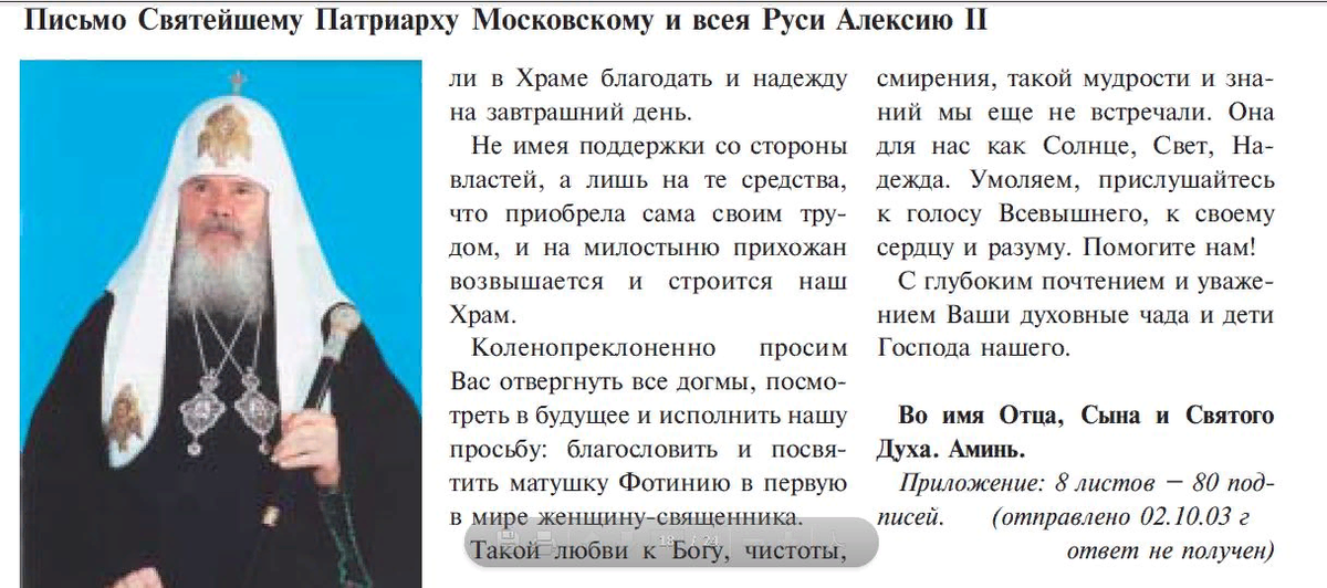 В 2003 году Светлана написала патриарху Алексию письмо с просьбой рукоположить ее в сан священника.