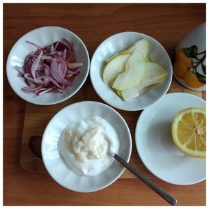 Первое, что нужно сделать, замариновать лук. Лук красный разрезаем пополам и одну половину нарезаем вдоль, длинными тонкими "чешуйками". Помещаем в посуду, заливаем водой с уксусом с добавлением сахара. Пусть постоит пока будем готовить следующие ингредиенты. Сметану соединяем с хреном. У меня хрен со сливками, он не такой "злой" и я по вкусу положила 3 ч л. Кладите хрен на свой вкус. Яблоко
