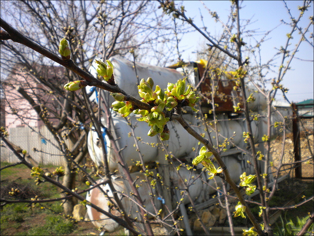 Ночью ни с того, ни с сего прошёл дождик, я было даже засомневался, ехать ли на участок, но к полудню засияло солнышко и я отправился. Необходимо было опрыскать Хорусом черешни и черевишню. На упаковках написано, что персики опрыскиваются по розовому бутону, а черешни "по зелёному конусу", т.е. когда цветочные почки ещё не начали распускаться.