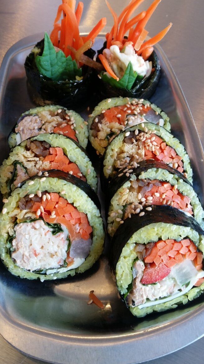 Лично мне больше всего (если выбирать из рыбы или мяса) нравится начинка из тунца, смешанного с майонезом (майонеза немного, просто чтобы тунец не был сухим). В этот раз я делала начинку из огурцов, моркови, авокадо, крабовых палочек + майонез, тунец + майонез, форели слабосоленой, перьев зелёного лука и кимчи. В некоторые я добавляла "Икру с копченым лососем", в некоторые - творожный сыр, но в бóльшую часть нет, я не люблю творожный сыр или мелкозернистую икру в кимпабах (потому что это уже привычные российские роллы, а не корейский 김밥). Однако, моим гостям нравитсявариант с творожным сыром или икрой, так что, сегодня добавила :)