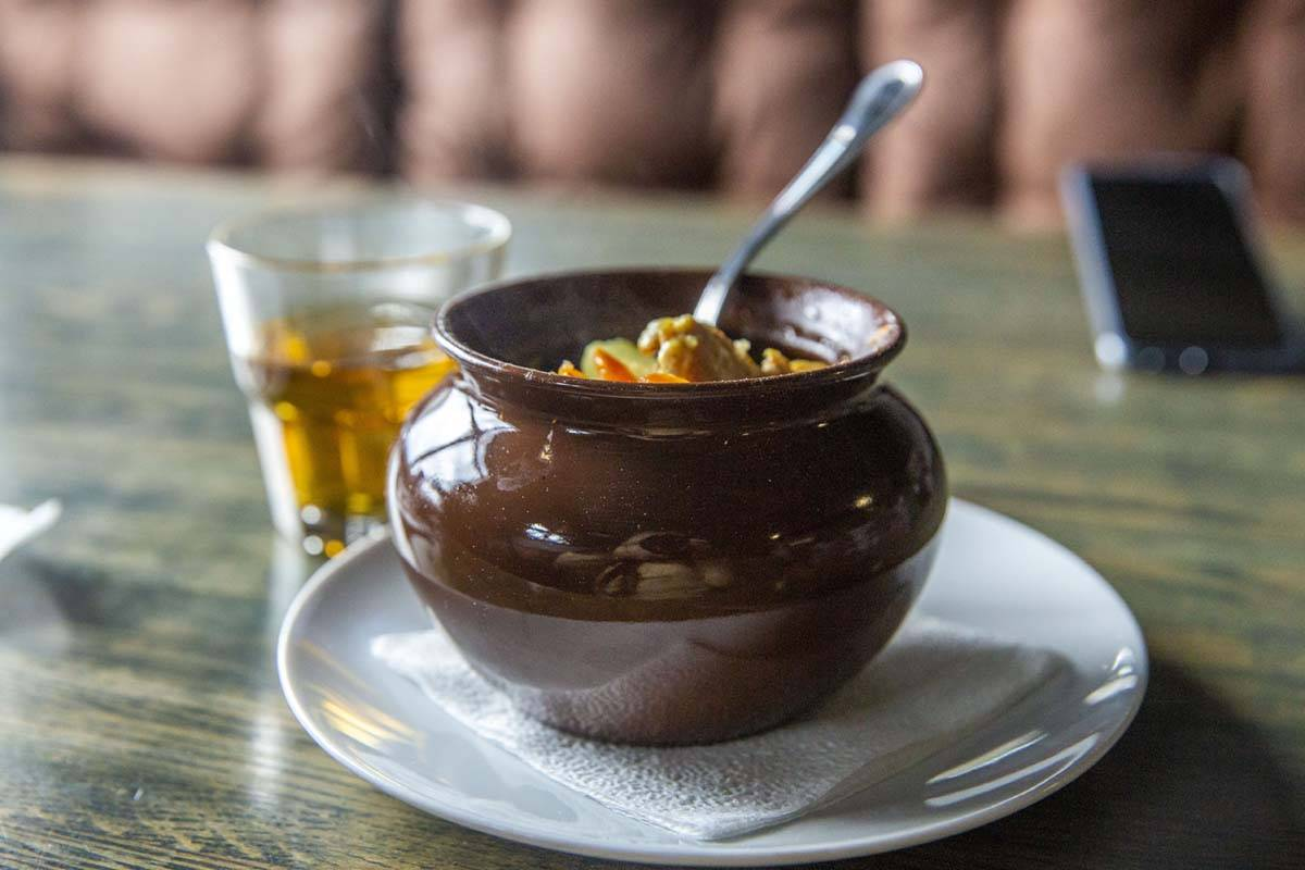 Только расправились с салатом — нам уже несут блюда в горшочках. Пар от них еще поднимался: верный признак того, что горшочки только-только достали из духовки. Бармен осторожно поставил их на стол и посоветовал быть аккуратнее: горячо ведь!