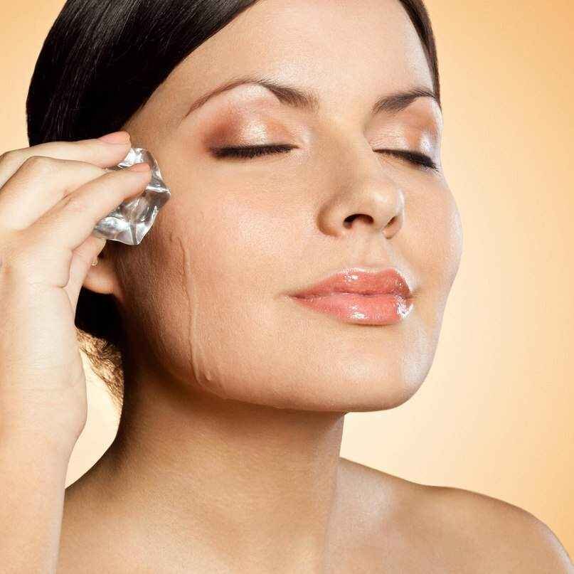 Перед протиранием нужно умыться прохладной водой, чтобы подготовить лицо к воздействию холода и не причинить коже вреда перепадом температуры.