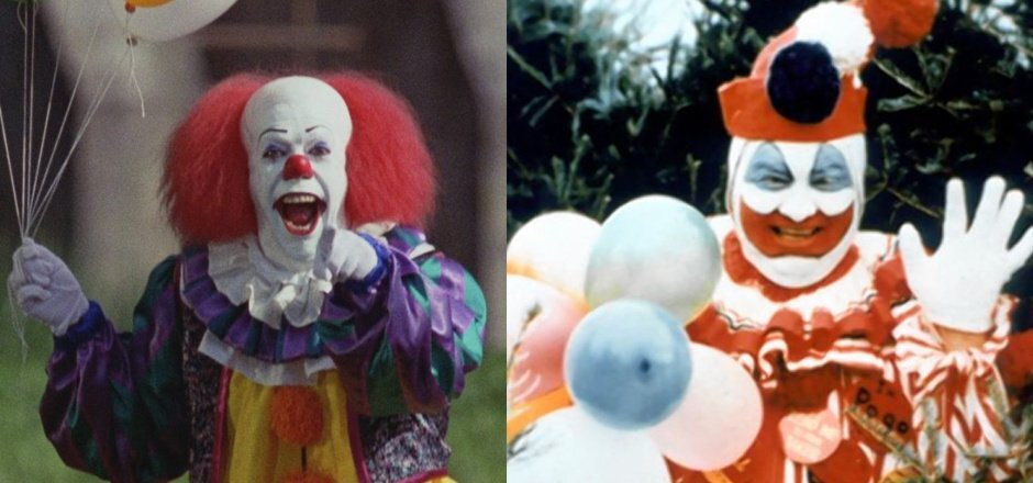 Фильмы: «Клоун-убийца», как прозвали Гейси газетчики, был арестован и передан суду в 1978 году. Примерно в то же время у Стивена Кинга родилась идея книги о древнем злом существе, пугающем маленьких детишек, и образ зловещего клоуна пришелся как нельзя кстати. Жуткий Пеннивайз, прототипом которого является Джон Гейси, искалечил психику юным зрителям в 1990-м году, а затем вернулся на экраны в 2017-м.