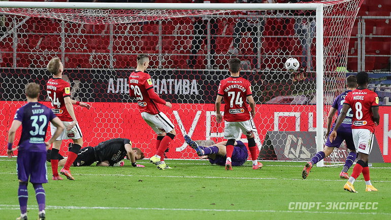 "Спартак" при счете 0:2 остался в меньшинстве. Но это было еще не все. Судьба жестко посмеялась над кабинетными войнами "Спартака". Что называется, продавили! После розыгрыша углового справа от Жамалетдинова Камилов бил, но попал в отставленную руку Кутепова.