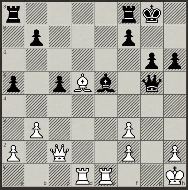 Предлагаю Вашему вниманию фрагмент партии Шлоссер - Петросян А., 1996 год. На шахматной доске не простое положение. У черных лишняя пешка. Однако, если белые заберут черную пешку слоном на b7, или ферзем на с5, то черные защитят слона ладьей на е8, и будут угрожать матом на h2. Однако у белых есть оригинальный вариант выигрыша. Белые начинают и выигрывают (получают материальный перевес).