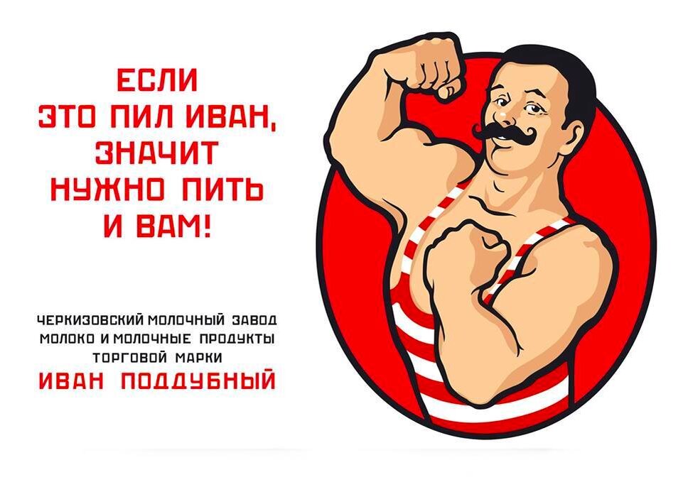 КАК ИВАН ПОДДУБНЫЙ БОРИСУ ЕЛЬЦИНУ ДОРОГУ ПЕРЕШЕЛ (История от Игоря Писарского) Торговая марка ИВАН ПОДДУБНЫЙ. В середине 90-х команда молодых продвинутых, по тем временам, ребят купили убитый совковый Черкизовский молочный завод. И пришли к нам в Агентство с задачкой разработки бренда линейки молочной продукции. На рынке царил тогда русский по крови, но совершенно нерусского вида зверек Вимм-Билль-Данн и про посконно-домотканные русские бренды никто слыхом не слыхивал. Наш Иван Поддубный стал первым. Судя по присутствию хитрой физиономии Андрей Бильжо в кадре с презентации бренда, автором идеи был он (Андрей, это так?), а вот слоган "Если это пил Иван, значит нужно пить и вам!", точно помню, родил Игорь Иртеньев. Зарегистрировали мы, значит, бренд и затеяли рекламную кампанию. А поскольку денег "на ящик" не было, решили ударить по наружке. Биллборды весенней Москвы 97-го, по-моему, года были заклеены плакатами: вот ровно такими как на фото ниже - с Иваном нашим Поддубным размером 3х
