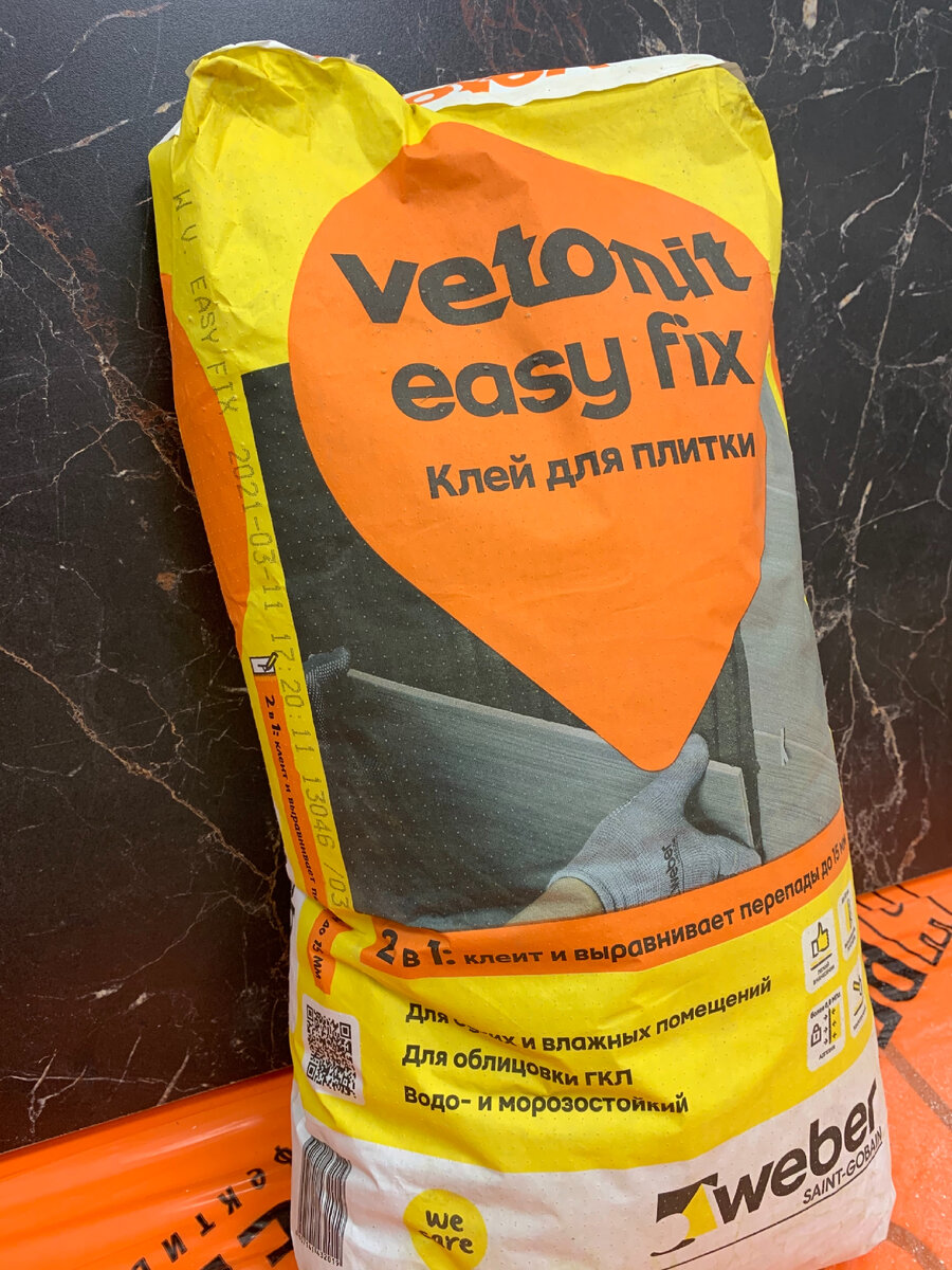 КЛЕЙ ДЛЯ ПЛИТКИ WEBER.VETONIT EASY FIX ДЛЯ ПЛИТКИ И КЕРАМОГРАНИТА, 25КГ Клей для плитки и керамогранита. НАЗНАЧЕНИЕ: Укладка керамогранита среднего формата, любой керамической плитки (в т.ч. двойного обжига) и мозаики на вертикальные и Горизонтальные поверхности внутри любых помещений; Укладка плитки на гипсокартонные, гипсоволокнистые листы и цементно- стружечные плиты, а также бетон (степень увлажнения менее 90%), ячеистый бетон, кирпич, стяжки, штукатурки и шпаклевки на цементной и цементно- известковой основе. ПРЕИМУЩЕСТВА: Высокая влагостойкость позволяет использовать во влажных помещениях (ванные комнаты, прачечные и душевые). Возможность выравнивать поверхности толщиной слоя до 15 мм. Высокая морозостойкость - более 100 циклов. ИНСТРУКЦИЯ ПО ПРИМЕНЕНИЮ: Подготовка основания: Во время выполнения облицовочных работ и в течение 2 – х суток после их окончания температура основы, клея и плиток должна быть не ниже +5 °С. Если температура окружающей среды выше 30 °С