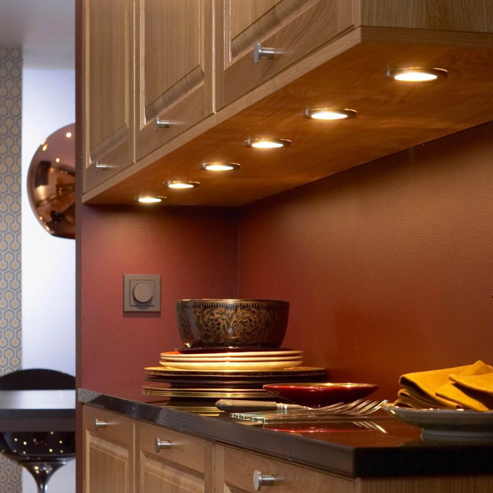 Покажем варианты освещения рабочей зоны для всех сценариев интерьера. Точечные встроенные светильники Такие светильники, встроенные в открытую навесную полку или навесные шкафы будут равномерно и ярко освещать столешницу. Потребляют такие споты не много энергии и стоят недорого. Накладные светильники Они отличаются от других удобством монтажа. Светильники крепятся на металлический профиль или деревянную решетку под верхней секцией шкафов. Такую конструкцию можно дополнить рейлингом и навесными элементами, а также встроить розетку. Настенный светильник Удобен тем, что его можно повернуть в любом направлении и подстроить пучок света под себя. Обычно такой вариант используют для лофта и сканди, но можно найти и консервативные модели для классических интерьеров. Потолочные светильники Это могут быть споты, шинные светильники или подвесы, но непосредственно над рабочей зоной. Этот вариант не на 100% эффективен, потому что небольшая тень от шкафов и вас самих всё же будет падать на столешниц