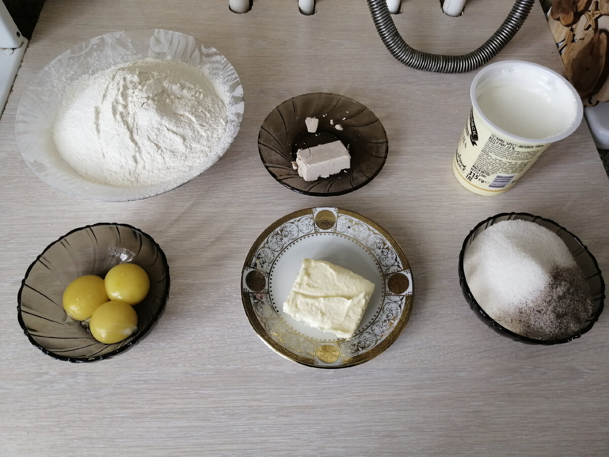 3 желтка взбиваем с оставшимся сахаром, солью и ванильным сахаром до пышности. Затем добавляем сметану, еще пару минут перемешиваем и добавляем крепкий алкоголь (по желанию). Опара должна уже подняться. Добавляем туда яичную смесь, перемешиваем и всыпаем 400 гр просеянной муки. Замешиваем "спиральками" вязкое и липкое тесто. Накрываем тесто пленкой и убираем в тепл