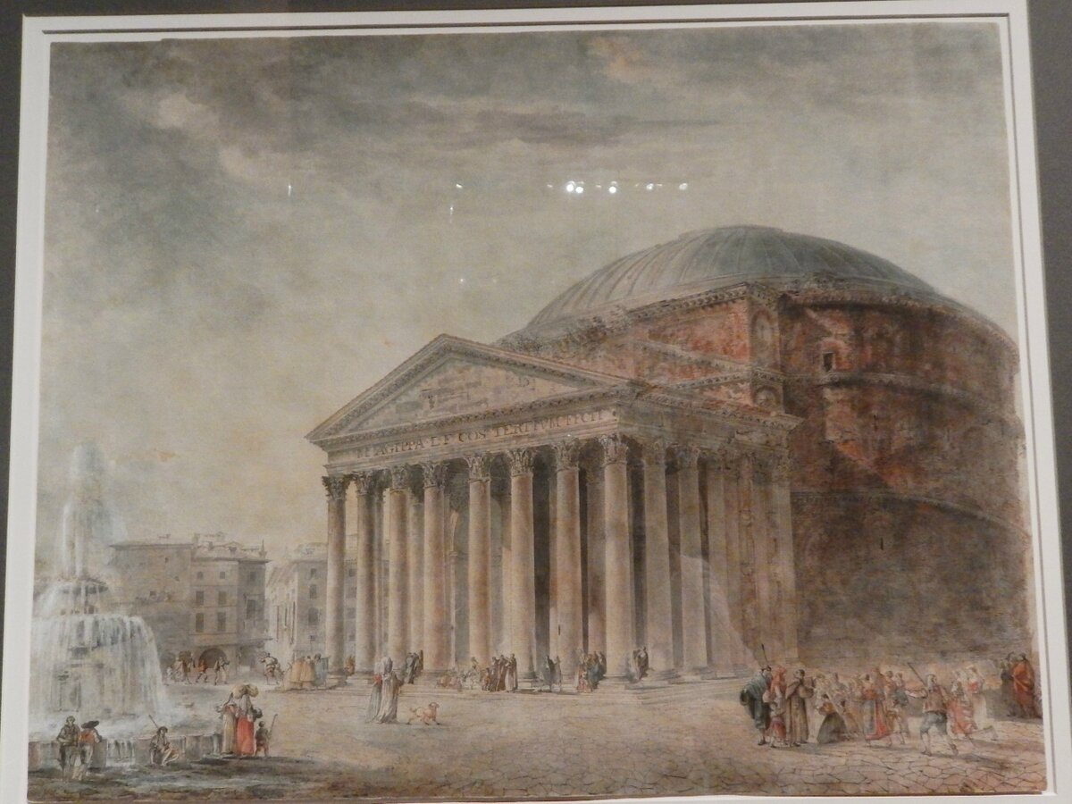 Тома де Томон неоднократно изображал Пантеон в своих архитектурных фантазиях и видовых акварелях. Известно, как минимум, еще два рисунка, где запечатлен тот же мотив – Каприччо 1787 г из частного собрания в Риме, а также лист 1790 г из коллекции Эрмитажа. Как в упомянутых, так и данном листе, автор не стремился к созданию топографически точной ведуты. В частности, на пьяцца Ротонда изображен фонтан из двух чаш, больше напоминающий источники с площади Святого Петра. Таким образом, художник идеализирует пространство Вечного города, находя своеобразные камертоны к античной архитектуре, более органичные, чем окружающий Пантеон реальный пейзаж.