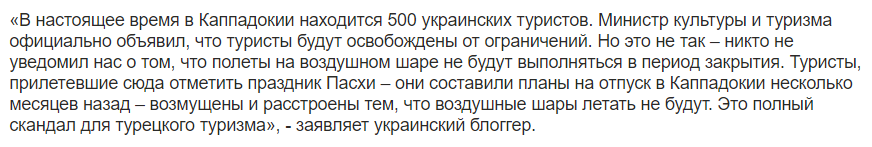 Интересно, туристов Турция вовсю зазывает, обещает им безграничный отдых, поездки по экскурсиям, музеям, достопримечательностям. Но при этом не разрешает посещать пляжи в некоторых провинция – например, в Бодруме, в Каше, пляж Капуташ – полиция прогоняет оттуда туристов со словами "go to hotel". Или объявляет запрет о полетах воздушных шаров в Каппадокии. Логично, что туристы возмущены. Источник Кроме того, в курортных регионах возникли большие проблемы с тем, что сотрудники туристических агентств не попадают под исключения действия комендантского часа, и к тому же, испытывают большие трудности с получением разрешения на работу. Таким образом, они не могут оказывать туристам оплаченные услуги – например, такие как банальная встреча в аэропорту.. Проблема сохраняется до сих пор, ассоциация туроператоров уже обратилась в Министерство туризма для разрешения вопроса. Источник Про комендантский час Про разное Про коронавирус Очень хорошо написал паблик "Турция - это". Источник Телеграм-кана