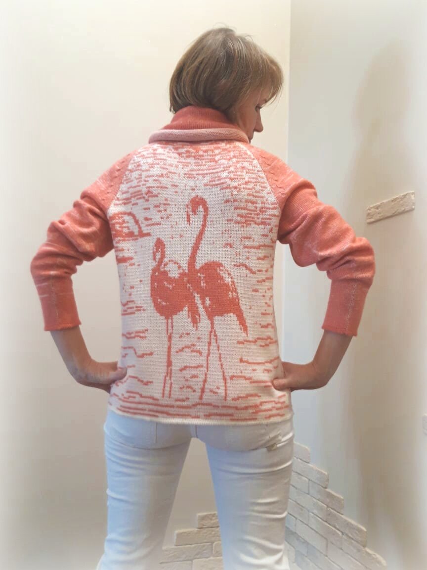 Приветствую, дорогие мои читатели! Сегодня расскажу немного о том, что очень люблю - вязание жаккардовых рисунков. Покажу пару своих работ в этой технике. Жаккард. Что это? Возможно, не все знают. Но вот про "свитер с оленями" знают практически все! А это и есть та самая техника вязания, при которой и получаются те самые олени. Мне всегда нравились вязаные изделия со всевозможными рисунками - начиная от снежинок-звездочек различных видов и до мультяшных героев. Свитера, варежки, джемперы, шапки, шарфы, даже носочки и гольфы получаются клевые. Рисунки раньше брала из журналов, после уже - из интернета, реже - рисовала вручную сама. Появление в моей мастерской электронной вязальной машины развязало мне руки! Программа для этой машины - мой верный помощник. Она позволяет и в прямом, и в переносном смысле творить чудеса. С огромным удовольствием я теперь рисую именно в ней. А потом - вяжу! Так, например, появился обожаемый "Фламинго" !