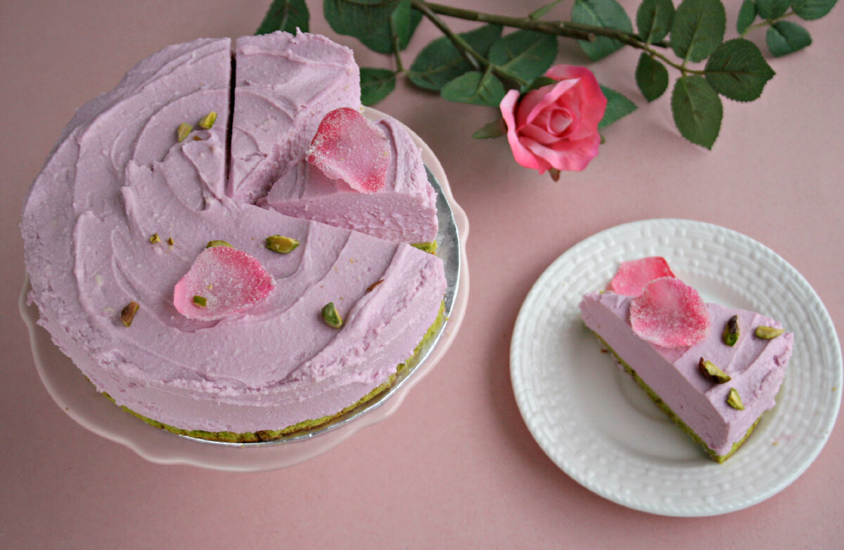 Розовый чизкейк "Нежное облако" Я люблю чизкейки за их воздушность и нежность! Предлагаю вашему вниманию розовый чизкейк: нежное облако начинки с ароматом розы на фисташковой основе. Для приготовления основы нужна фисташковая паста. Её можно купить, либо приготовить в домашних условиях: это смесь перемолотых фисташек и миндаля, соединённых с сахарным сиропом.