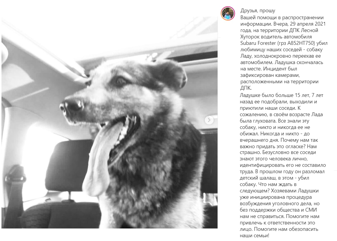 Инцидент произошёл в ДПК Лесной Хуторок Владимирской области. Хозяева уже написали заявление в полицию, на водителя планируют завести уголовку. Собаку звали Лада, ей было более 15 лет. 7 лет назад Ладу подобрали, выходили и приютили жители посёлка.