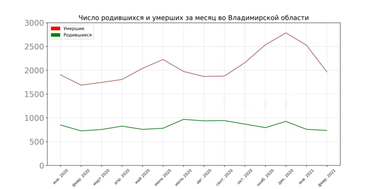 В первые два месяца 2021 года смертность во Владимирской области превысила рождаемость в 3,1 раза. За этот период на территории региона родились 1493 человека, а умерли 4493. Также во Владимирстате заявили об увеличении коэффициента детской смертности на 40%