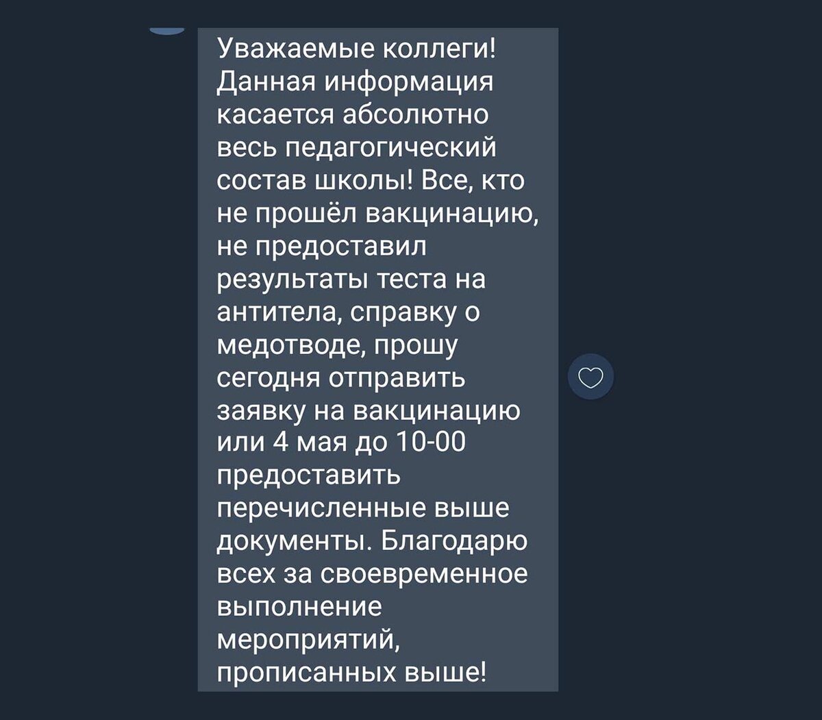 Сегодня 1 мая. Праздник. Никто не работает. Кроме регионального министерства образования, ведь именно они сегодня прислали грозную бумагу с требованием для директоров отчитаться о вакцинации с указанием причин и справок. Сегодня 1 мая, завтра 2 мая - воскресенье, 3 мая понедельник, но тоже вероятно все отдыхают, ну вот как раз к 4 мая чтобы всё было готово, прямо к 10 утра. Как бы надо бежать, куда бежать? Ну делать тест на антитела! Правда у меня нет с собой самолёта с гараже, чтобы взять и долететь, доехать то я не смогу. Всё - зима кончилась. Придётся с утра 4 мая идти в больницу, если она работает конечно, просить справку о медотводе. Авось успею до работы, ведь 4, 5, 6 и 7 мая мы всё равно работаем. А так вообще праздник конечно - 1 мая, директор поздравил и опять напомнил: Я тут даже подумал, что директор это специально из вредности нам всем учителям отправил. А ему из департамента или отдела образования это прислали, тоже чтобы лишний раз понервничали, ведь с подводной лодки то