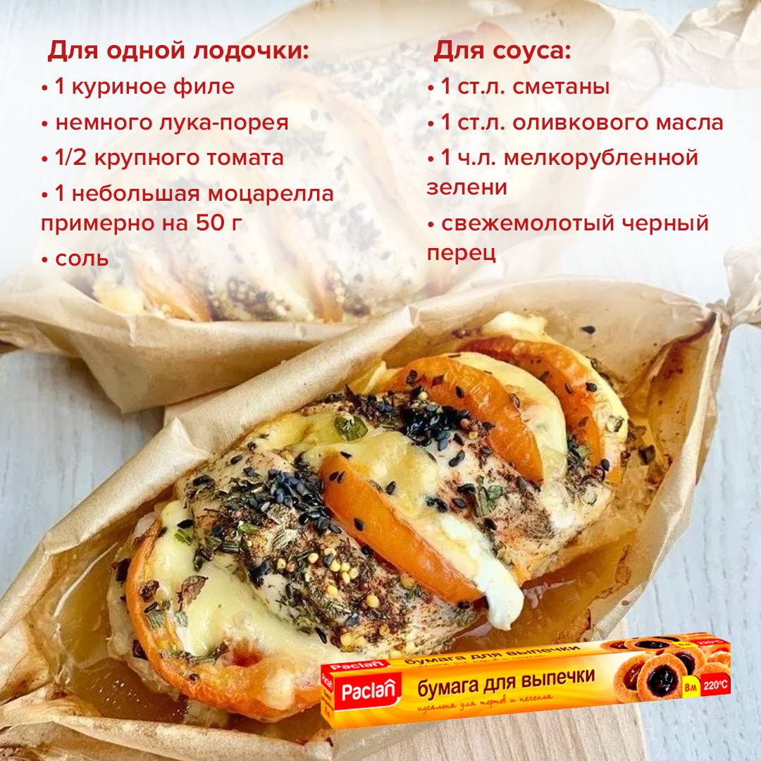 Восхитительная, нежная и сочная курочка в лодочках из бумаги для запекания P. Нежная, сливочная, да ещё... ! Готовим? Всё, что вам понадобится, на картинке. А действовать так: Шаг 1. Делаем соус. Просто хорошенько смешиваем все ингредиенты. Шаг 2. Нарезаем тонкими кружочками помидоры и моцареллу. Шаг 3. Лук-порей режем кольцами и выкладываем на бумагу для выпечки. Шаг 4. Солим курицу, затем с одной стороны наносим соус и кладём этой стороной на подушку из лука. Смазываем соусом. Шаг 5. Выкладываем на филе внахлёст помидоры, сверху - моцареллу. Шаг 6. Длинные стороны бумаги несколько раз подвернуть так, чтобы получились бортики. Концы закрутить, как на фантике конфеты. Шаг 7. Выпекать в предварительно разогретой до 200 градусов духовке 15-20 минут. Лучше всего на режиме "верх-низ + обдув". Подавать на стол прямо в лодочках.
