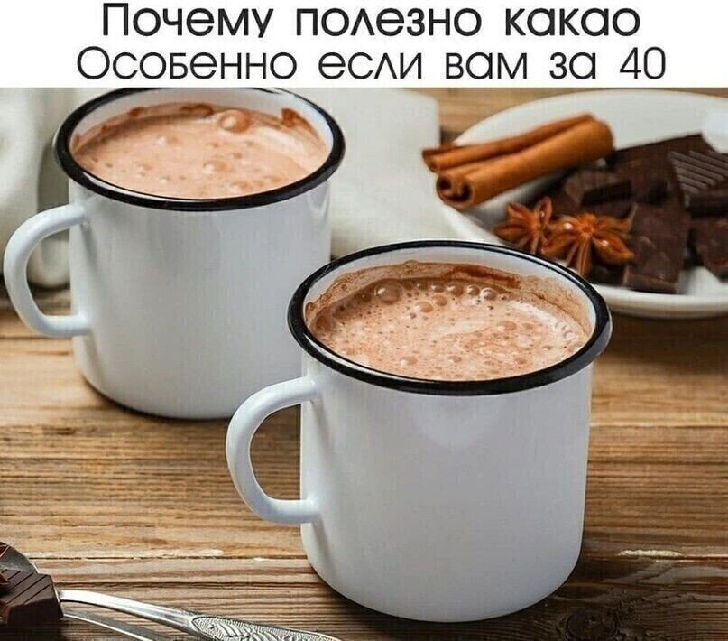 Этот вкусный напиток заряжает энергией и способен защитить от вирусов и инфекций. Чашка какао с утра улучшит настроение и повысит жизненный тонус. Он содержит вещества, которые улучшают память и стимулируют работу головного мозга, а также нормализуют в крови уровень холестерина. Какао признан лидером по содержанию многих полезных микроэлементов, а по количеству содержащегося в нем цинка ему вообще нет равных! Какао-бобы имеют белки (12-15%), жиры, углеводы (6-10%), витамины группы В, клетчатку и антиоксиданты. Недавние исследования обнаружили, что какао имеет еще одно соединение (кокохил), которое способствует размножению и росту клеток кожи, заживлению ран и предотвращает образование морщин. Также в какао есть еще одно вещество — эпикатехин, благодаря которому можно защитить свой организм от множества опасных болезней, таких как рак, диабет, инфаркт и инсульт. Американские ученые подтвердили тот факт, что несмотря на то, что какао имеет больше калорий, чем чай и кофе, оно не при