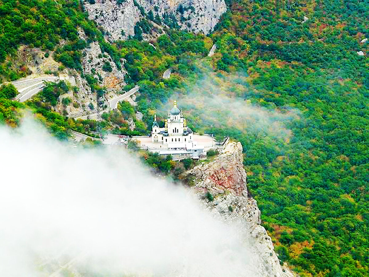 Крым Церковь Воскресения Христова. Церковь построена на краю утёса - на Красной скале, над посёлком Форос на высоте 400 м над морем. Является памятником русской архитектуры 19 века. Воскресенская церковь (другое название храма) была построена на средства А.Г. Кузнецова, владельца имения Форос в честь события чудесного спасения государя-императора Александра Третьего и его семьи во время крушения поезда, шедшего из Крыма в Петербург 17 октября 1888 года. В последствии царская семья часто посещала этот храм. Нередко в эту церковь приезжал А. П. Чехов. Сохранилось свидетельство о том, что А. П. Чехов участвовал в строительстве церковно-приходской школы. До 1917 года при храме имелась школа грамоты. На десятую годовщину чудесного спасения от напрасной гибели царя Александра Третьего, храм посетил император Николай Второй с супругой Александрой Фёдоровной и маленькими Великими княжнами. Единственным дореволюционным священником церкви был Павел (Ундольский), родом из Владимирской губернии и