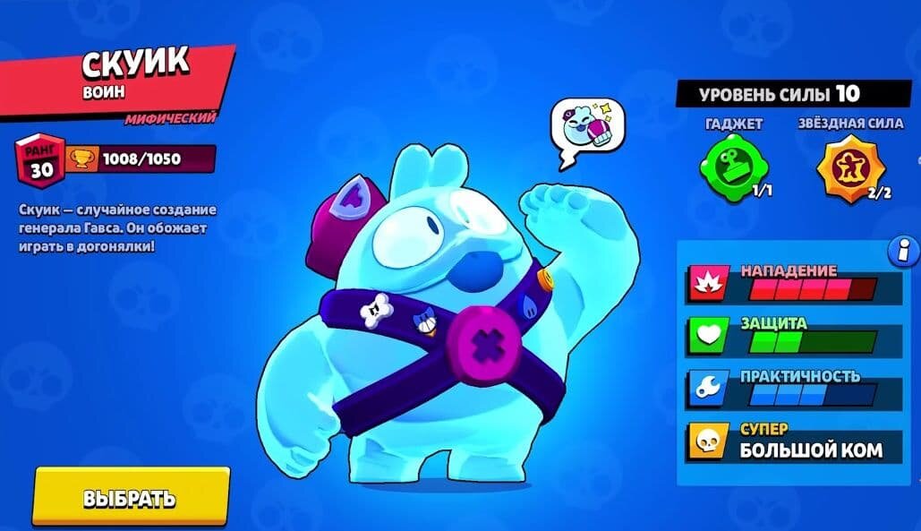 Основная атака — Липкий ком. Скуик выпускает комья, которые абсолютно неустойчивы и могут в любой момент разлететься на мелкие кусочки. Если оппонент получил поражение изначально, то они обязательно прилипнут к нему. Также в зоне риска находятся противники, которые приблизились к кому слишком сильно. Супер атака Скуика в Бравл Старс — Большой ком. Скуик может внезапно стрелять комом, который взрывается через определенный промежуток времени. И следует сказать, что сила взрыва просто поражает. В результате все враги, находящиеся поблизости, будут обездвижены. После основного взрыва вокруг будут выброшены шесть комьев меньшего размера, которые могут в буквальном смысле выбить противника с его местоположения. Имеющаяся у Скуика звездная сила под номером один в Бравл Старс имеет название Цепная реакция. Увеличение урона от каждого кома на целых десять процентов после каждого поверженного врага. Звездная сила номер два называется Сверхлипкост Помимо прочих эффектов, липкие комья С