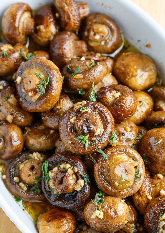 Нежные запеченные чесночно-масляные грибы - прекрасная закуска или гарнир к любому любимому блюду. Ингредиенты: 500 г грибов шампиньонов 3 ст.ложки сливочного масла комнатной температуры 1 столовая ложка масла (растительного или оливкового) 2 зубчика чеснока солить по вкусу душистый перец по вкусу 1 столовая ложка лимонного сока 1 чайная ложка листьев тимьяна Рецепт приготовления: 1. При необходимости протрите каждый гриб влажным бумажным полотенцем, чтобы удалить рыхлую грязь и мусор. Слегка промойте под холодной водой и тщательно промокните бумажным полотенцем. (Примечание! Не замачивайте грибы, так как они впитывают воду, как губка, и не подрумянятся во время приготовления) 2. В большой миске смешать грибы с маслом, измельченным чесноком, добавить соль и порошок черного перца по вкусу, перемешать. 3. Выпекать в предварительно разогретой духовке при 220 градусах, 25 минут или до золотистого цвета снаружи. 4. Затем сбрызнуть лимонным соком и добавить тимьян. Перемешайте и подавайте г
