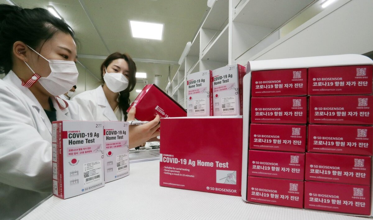 На фабрике SD Biosensor в Осонге, провинция Северный Чхунчхон, южнокорейский производитель лекарств, производящий наборы для самотеста на COVID-19, и его сотрудники проводят окончательную проверку перед тем, как продукты поступят в продажу в местных аптеках и через интернет-каналы. В тестовых наборах SD Biosensor используется стерильный тупфер, с помощью которого люди могут обнаруживать специфические антигены COVID-19, присутствующие в образцах, взятых из полости носа.