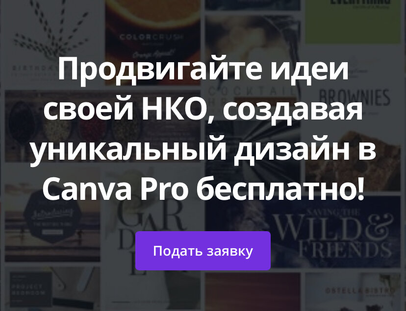 Возможности расширенной версии: Как подать заявку на бесплатный аккаунт: 1) Имя и фамилия, 2) Название НКО, 3) Веб-сайт, 4) Ваша роль, или занимаемая позиция, Сколько людей вовлечено в проект, 5) E-mail, на который зарегистрирован аккаунт Canva для использования вашей организацией, 6) Контактный электронный адрес, 7) Страна, где сосредоточена ваша деятельность, 8) Главная цель, к которой стремится ваша организация из списка ООН, 9) Чего вам уже удалось достичь на текущий момент. 3.Приложите сканы документов, подтверждающих статус НКО – это должно быть Свидетельство о регистрации некоммерческой организации, выданное Министерством юстиции РФ, и отметьте, что ознакомлены с Правилами и условиями использования. 4.Ожидайте проверку данных и обратную связь по указанному адресу. 5.Приступите к использованию Canva Pro со всеми ее преимуществами совместно с другими 10 участниками.