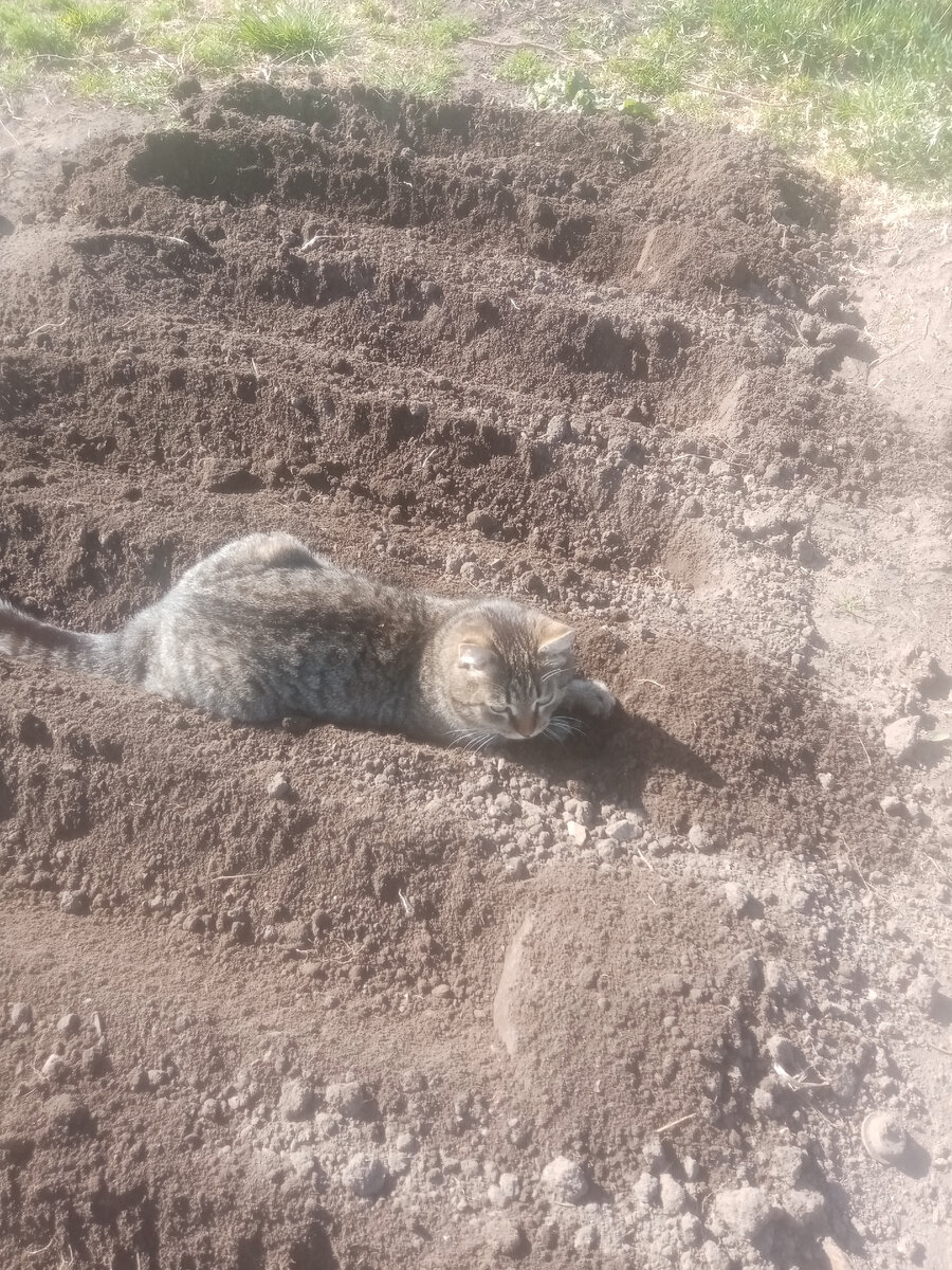 На даче посеяла морковку. Сейчас у меня новый помощник Лев), а раньше помогала кошка Лапа, но она ушла в декрет. Пока я подготавливала грядку, кот Лёва грелся на солнышке, в проделанных мною бороздках. Лёва необычный кот! Он, так сказать, интеллигент. Всё детство он провёл в квартире, а как подрос, переехал на дачу. Стал почти деревенским котом, но повадочки остались. Например, свои "дела" Лёва предпочитает делать не на простых грядках, чеснок там или лук, а на цветочных, где тюльпанчики распускаются😁🤭. В садике подрыхлила приствольные круги яблонь, груши, кустов смородины и крыжовника. Яблоньки ещё только просыпаются, несмело появляются почки. А груша меня порадовала, набирает цвет. Если цветы сохранятся, не замёрзнут и не