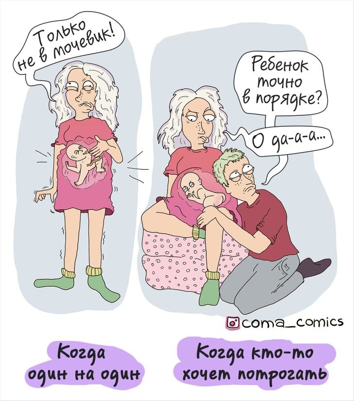 Александра Сиренко — неунывающая мама, для которой декрет стал настоящим творческим прорывом. Она рисует комиксы о материнстве, семейной жизни и демонстрирует типичные ситуации из жизни женщин. Тут вам и юмор, и ирония, и сама жизнь. Главный идейный вдохновитель художницы — собственная дочь. Иллюстрации Саша выкладывает на своей странице в инстаграме, где тысячи единомышленниц подтверждают правдивость ситуаций. Кого-то они поддержат в декрете, кому-то напомнят о том, как это было, а кого-то подготовят к возможным трудностям семейной жизни. А в бонусе покажем неловкую ситуацию, в которую попадала ну просто каждая девушка, и один весьма годный лайфхак. Закон подлости беременных «Ну когда же я уже рожу?!» Первые минуты после родов Роды — не самое тяжелое, что предстоит мамам Я в 16 лет и я в 25+ Одолевают мысли о том, что современным детям с одеждой повезло во много раз больше Сон тогда и сейчас Одна из неразгаданных загадок природы: почему в будние дни так сильно хочется спать, а в выход